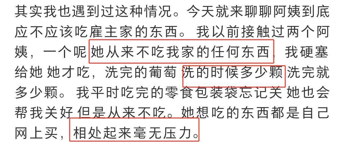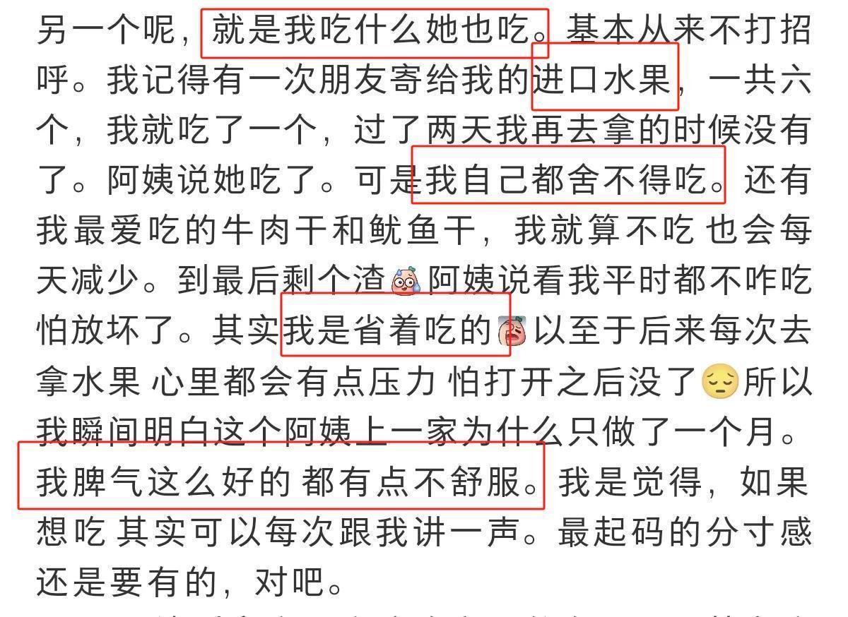 她在12月16日,发布了最新的一则吐槽帖,标题明晃晃一排,“住家阿姨应不应该吃雇主家的水果?”