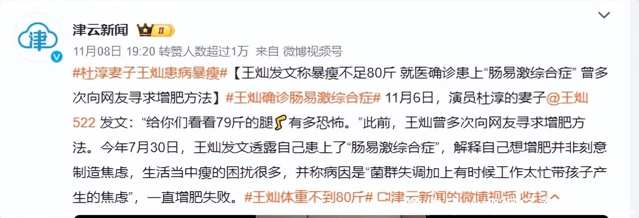 11月初,王灿晒出了一则工作视频,她表示自己的体重骤降,只剩下不到80斤,腿都细得不好看了。